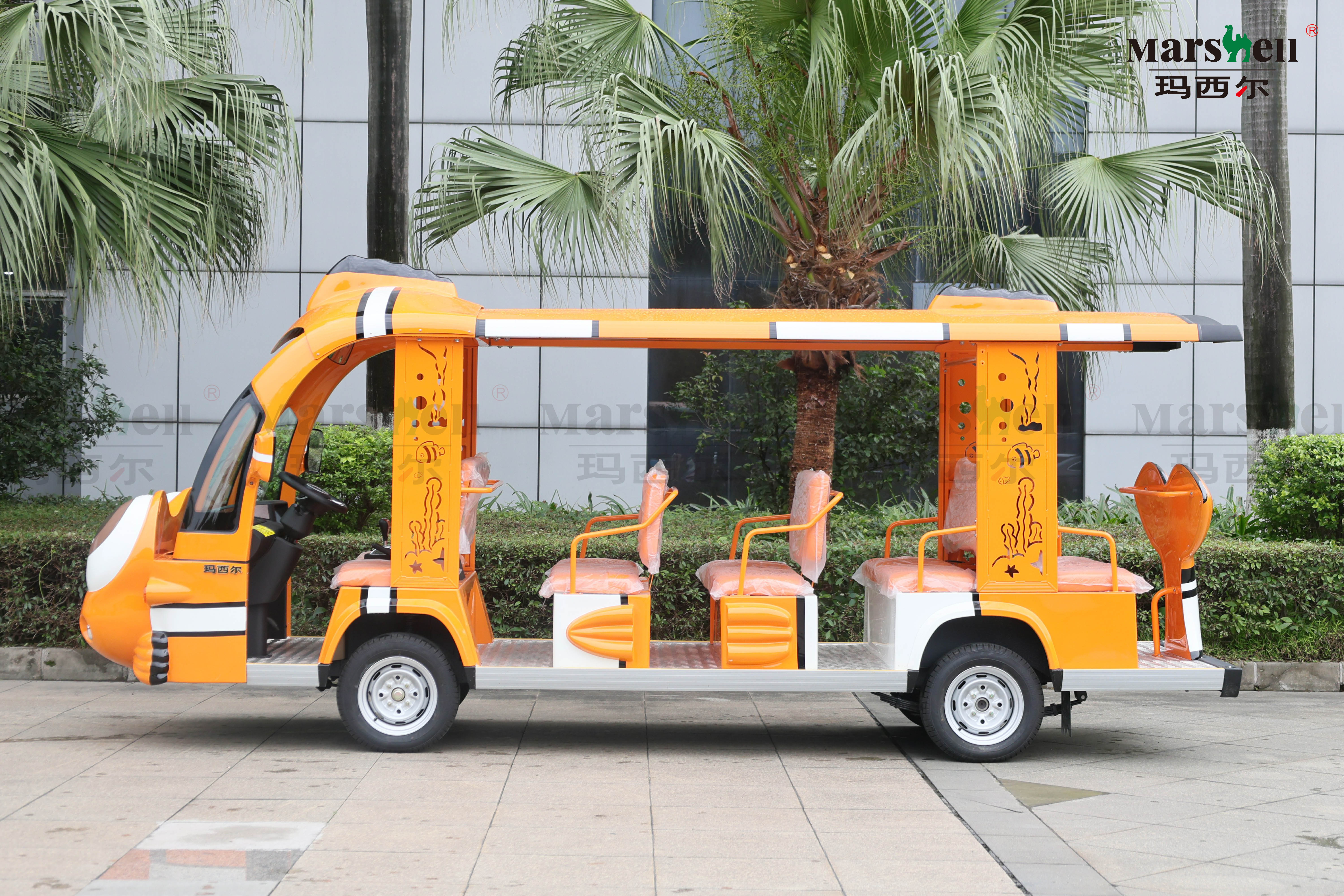 玛西尔智对小丑鱼造型主题电动观光车根据一对一的专业设计制造服务,延伸出各种造型电动观光车,根据不同使用场景单独开发新车型,造型时尚漂亮,更好的适应客户需求。